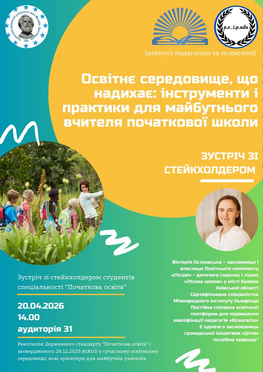 Кафедра початкової освіти та інноваційної педагогіки Педагогічного факультету Українського державного університету імені Михайла Драгоманова продовжує розвивати практикоорієнтований вектор підготовки майбутніх педагогів та запрошує здобувачів вищої освіти спеціальності «Початкова освіта» до участі у важливій професійній події — зустрічі зі стейкхолдером.