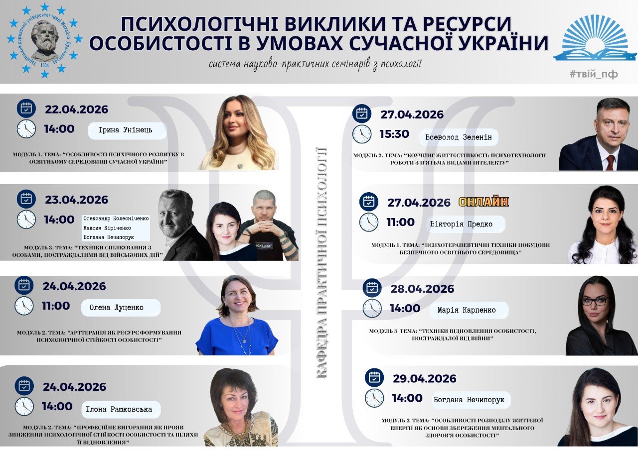 Запрошуємо до участі у системі науково-практичних семінарів з психології «ПСИХОЛОГІЧНІ ВИКЛИКИ ТА РЕСУРСИ ОСОБИСТОСТІ В УМОВАХ СУЧАСНОЇ УКРАЇНИ» (22-29.04.2026)