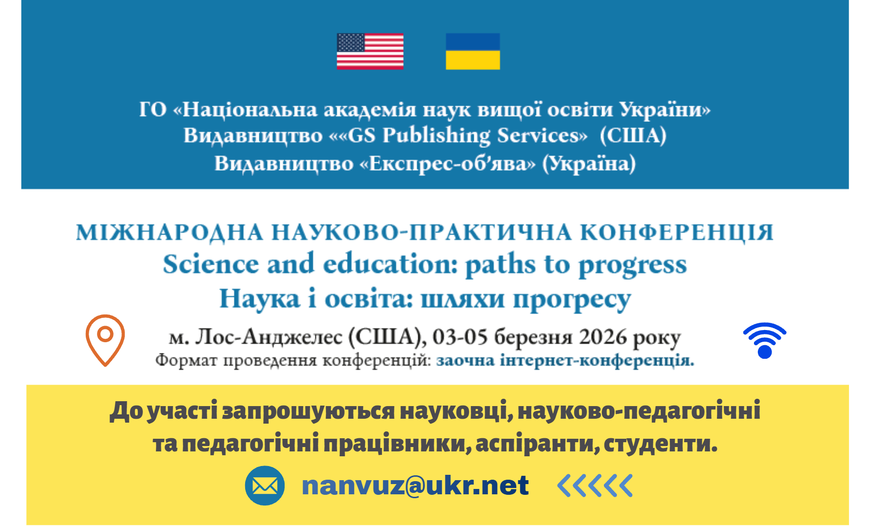Запрошуємо на Міжнародну конференцію «Наука і освіта: шляхи прогресу» (Science and education: paths to progress) (Лос-Анджелес; 03-05.03.2026)