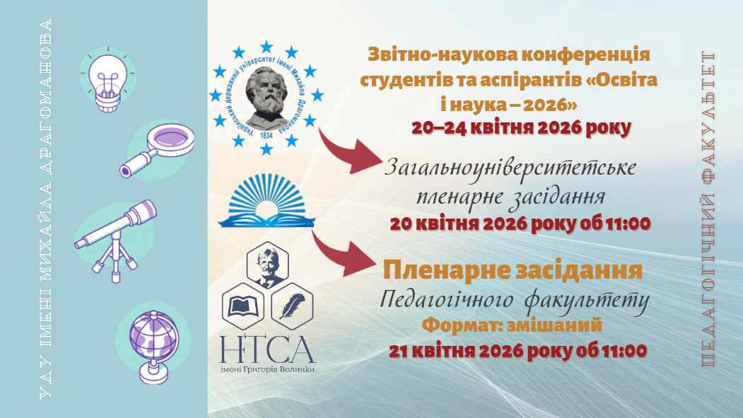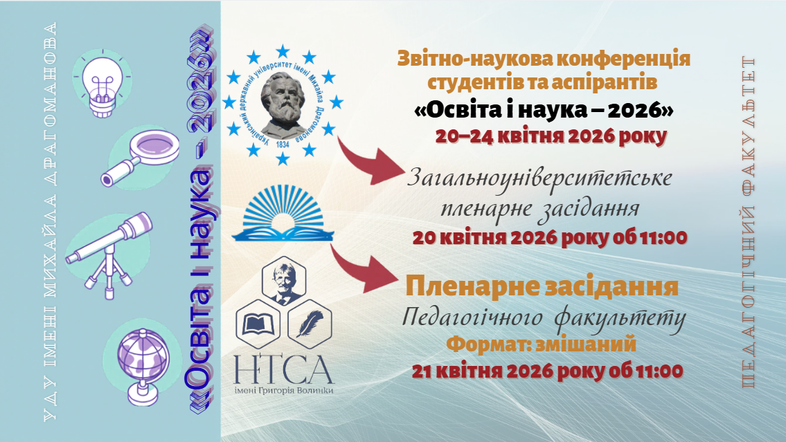 З метою розкриття наукового та творчого потенціалу студентів та аспірантів, розвитку в них наукового мислення і навичок дослідницької роботи, популяризації різних галузей науки в університеті, підвищення якості підготовки фахівців, керуючись Положенням про Наукове товариство студентів та аспірантів імені Григорія Волинки в період з 20 по 24 квітня 2026 року на базі університету: факультетів та навчально-наукових інститутів буде проведено щорічну звітно-наукову конференцію студентів та аспірантів «Освіта і наука – 2026».