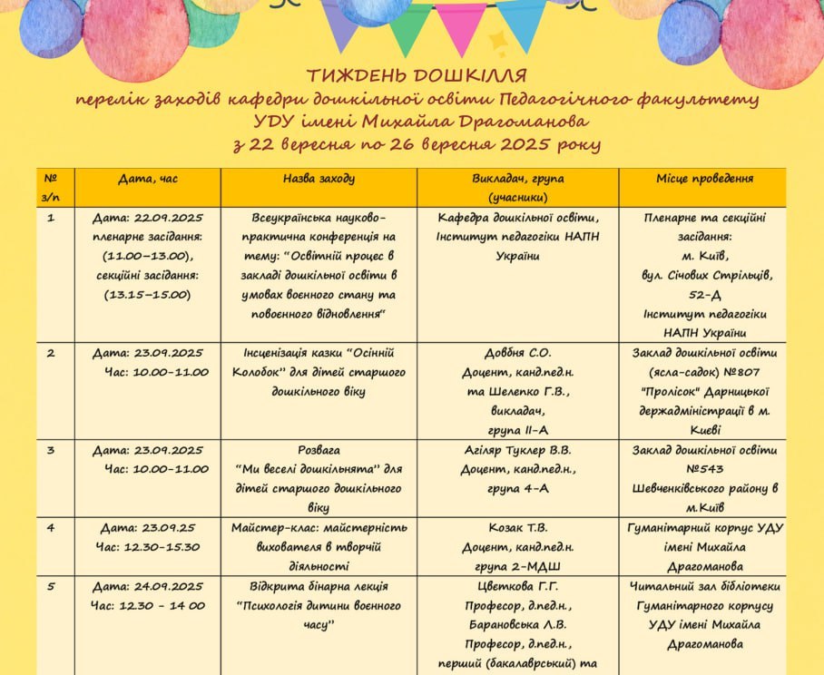 🤗✨ З 22 по 26 вересня 2025 року з метою відзначення Всеукраїнського дня дошкілля кафедрою дошкільної освіти та здобувачами першого (бакалаврського) та другого (магістерського) рівнів вищої освіти спеціальності “Дошкільна освіта“ у організовується низка цікавих, пізнавальних та розважальних заходів, як-то: